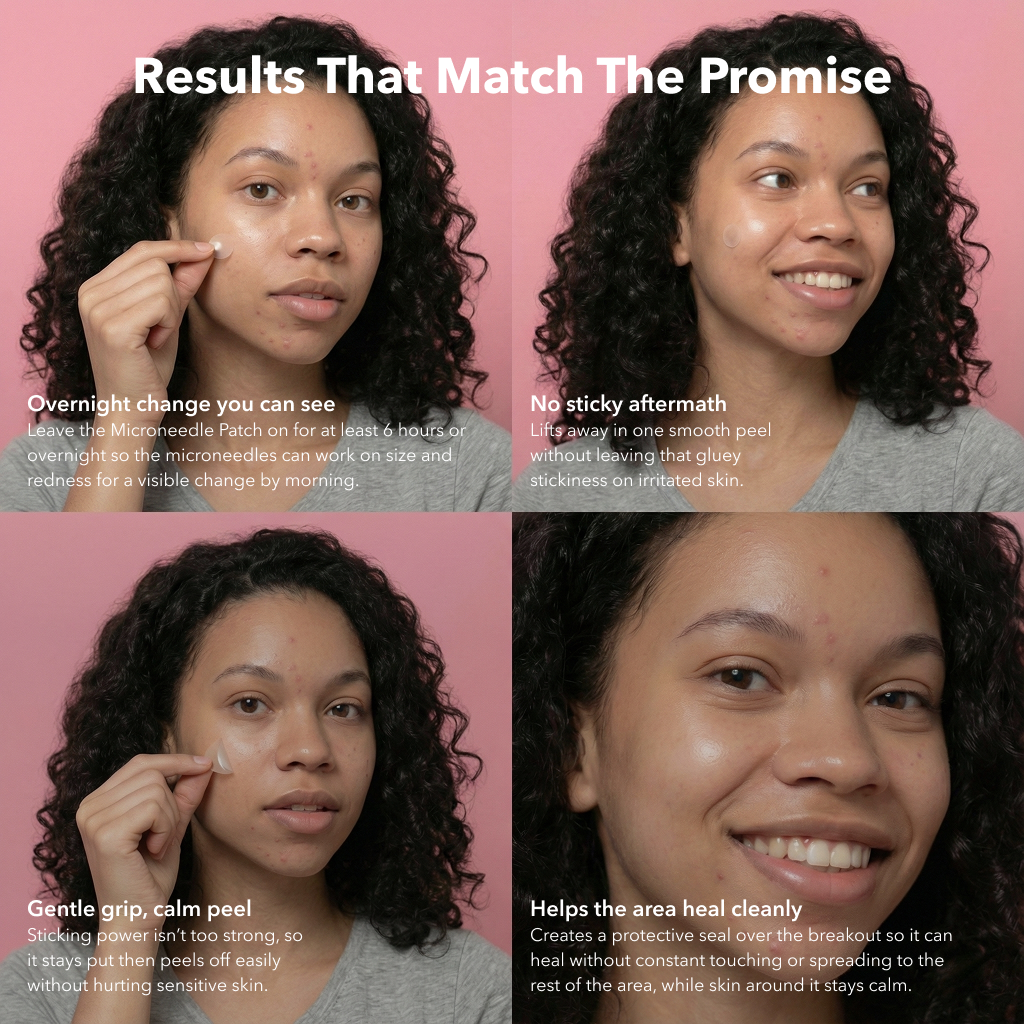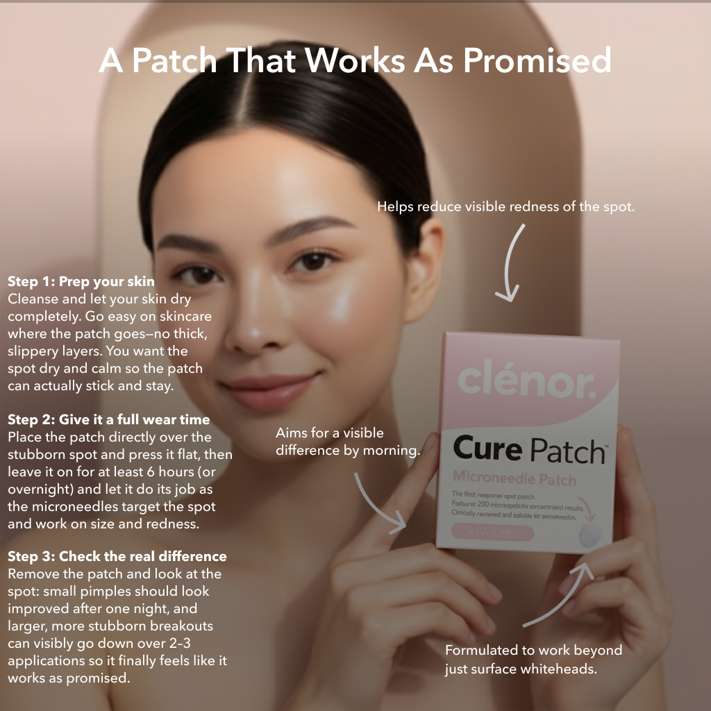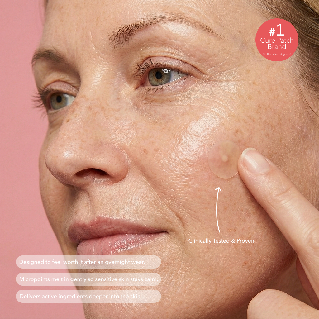 Cure Patch™ is designed for those moments. A hydrocolloid base protects the area while dissolving microneedles help deliver targeted skincare ingredients where the bump starts. So you can wake up to a spot that looks calmer, less red, and less raised.